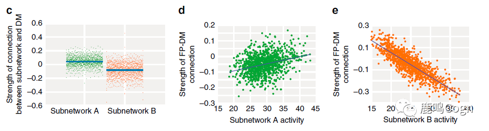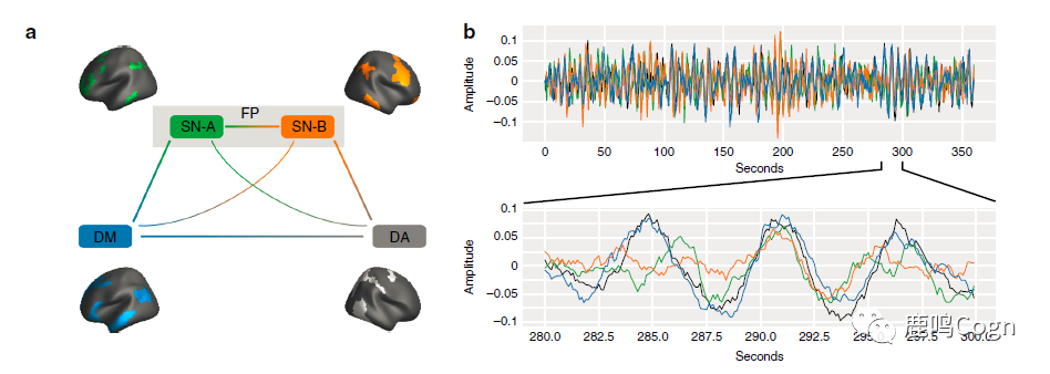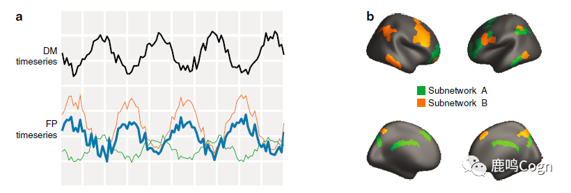 作者认为,FPN的动态会直接调节FPN和DMN之间的连接强度,他们提出的假设机制是:FPN由两个独立的、不重叠的子网络组成。其中,子网络A与DMN的动态正向相关,子网络B和DMN的动态反向相关(图1a)。当第一个子网络的相对活动比较强的时候,DMN和FPN之间的连接就是正向的;第二个子网络相对活动强的时候,DMN和FPN之间的连接就是负向的。这个假说可以解释DMN和FPN之间功能连接的灵活动态变化,也可以解释WM个体差异与网络间连接强度的关系。