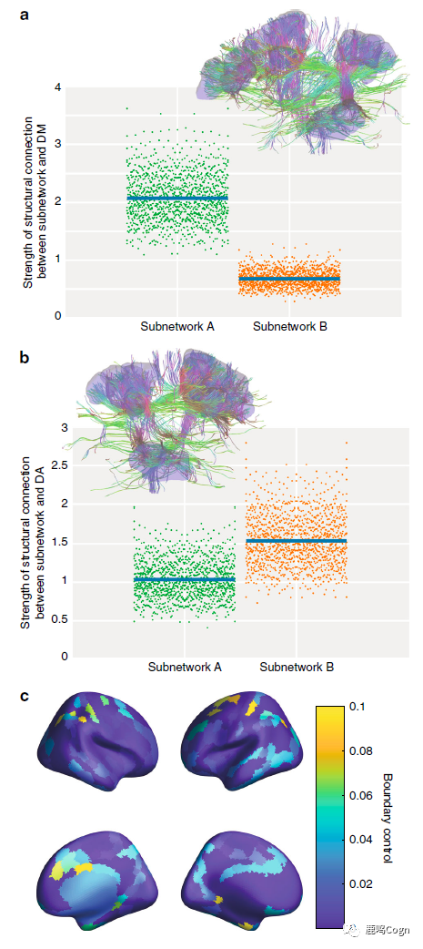 为了验证上述模型,作者首先利用加权随机分块模型(weighted stochastic block model; K=2),找到了这两个分离的子网络(图1b)。通过比较这两个子网络的基因表达模式差异,结果进一步表明这两个子网络在生物学上存在分离。图1 (A)默认网络(DM)活动、额顶网络(FP)以及两个分离的子网络活动的示意图。(B)额顶子网络A和子网络B。为了验证第二个假设,这里用两个子网络和DMN做了功能连接分析,结果发现,子网络A与DMN表现出正向的功能连接,而子网络B与DMN表现出负向的功能连接(图1c)。此外,与背侧注意网络(DAN)的功能连接结果发现,子网络B与DAN的连接为正向;子网络A与DAN的连接为负向。进一步,从网络动态活动上而言,子网络A的活动强度与DMN和FPN之间的功能连接有显著的正相关(图1d),而子网络B的活动强度与两个网络间的功能连接又显著的负相关(图1e)图1(C)两个子网络与默认网络的功能连接;(D)子网络A(E)子网络B的强度与额顶网络和默认网络连接强度的关系从与行为结果关系的角度而言,由于DMN和FPN之间的连接强度本身可以负向预测WM表现,因此作者进一步预测两个子网络的活动与行为结果之间存在相应的关系。结果如预期一致,子网络A的活动与WM表现负相关;子网络B的活动与WM表现正相关。接下来,研究者从网络白质结构的角度进行了探索。相似地,结果发现子网络A相对而言与DMN有着更强的结构连接(图2a);而子网络B相对与DAN有更强的结构连接(图2b)。这些结果表明,FPN可能处于一个结构连接体的位置,介导了DMN和DAN之间的耦合,且这种耦合与行为表现存在负向关联。此外,作者还计算了与DAN和DMN有关的区域边界控制(regional boundary control;图2c),结果表明,在20个边界控制超过95%的区域中,至少9个区域位于额顶网络,说明FPN的结构位置可以有效控制DMN和DAN之间的耦合。