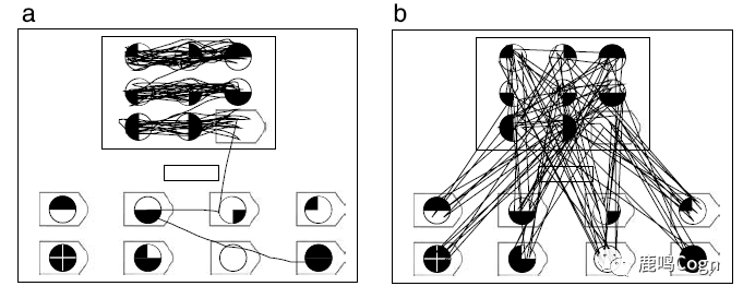 (左)高智力个体的解题策略:充分编码题目,再选答案;(右)低智力个体的解题策略:频繁在题目和选项中切换。(Hayes et al., 2011)