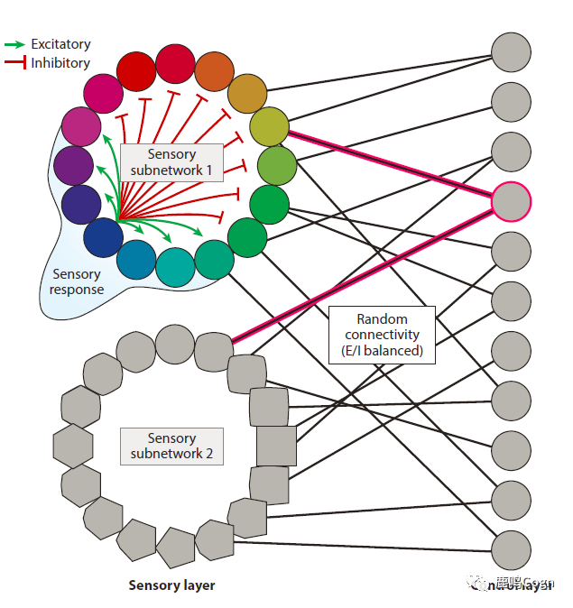 Bouchacourt和Buschman在2019年提出的灵活工作记忆模型(flexible working memory model;FWMM)就是这样一个框架(图1)。FWMM在一个结构化层和一个非结构化层(随机层)的交互之中灵活存储任意的感觉输入。第一层是作为感觉层,包含多个子网络,每一个分别表征不同领域的感觉加工(如颜色、形状、方向等)或空间中的不同位置。每个感觉神经元接受特定的感觉输入,加上局部的循环连接,将神经元调谐到输入空间的特定部分。之后,感觉层随机地与控制层的神经元相互连接。这些连接的互通性和随机性对于WM的灵活性非常重要。图1 灵活工作记忆模型(FWMM)。记忆保存在感觉层(左)和控制层(右)的交互之中。感觉层包含多个子网络(用不同颜色或形状表示),感觉层内部的连接可以是兴奋性的(excitatory;绿色表示)或抑制性的(inhibitory;红色表示)。对于靠近区域的促进、对于远端位置的抑制反映了区域邻近对刺激偏好的相似性(外侧曲线表示调谐曲线)。感觉层和控制层之间的连接是随机和互通的,并且有着平衡的兴奋性和抑制性连接(E/I balanced)。控制层接受所有感觉层子网络的信息输入,构成联合神经元(conjunctive neurons)。感觉层和控制层之间连接的互通性是维持WM表征的原因,因为这两层网络构成了吸引子网络(attractor network),其表征是稳定的。此外,随机连接的分布性质意味着控制神经元也可以激活其他感觉子网络的神经元,但由于投射是随机的,自上而下的输入是非结构性的,因此会诱发大概相等数量的激活和抑制,也就是说,在其他感觉子网络中的自上而下信号是被抵消的。除了防止子网络间的干扰,两层之间连接的随机性也赋予了网络的灵活性。WM的容量极为有限,作者认为这是因为当不同的表征汇聚到额顶控制皮层的时候,不同表征之间的相互干扰导致的。也就是说,联合皮层信息的整合促进了灵活性,但限制了记忆容量,WM的灵活性和容量是一种权衡关系。
