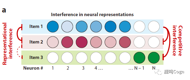 对WM的干扰分为两类(图2a),一种是WM中两个项目的表征重叠会导致表征性干扰(representational interference);另一种是记忆项目在相同神经元集群中相互竞争被表征,导致一种竞争性干扰(competitive interference)。下面将具体讨论这两种干扰。