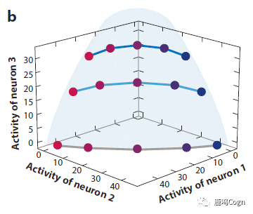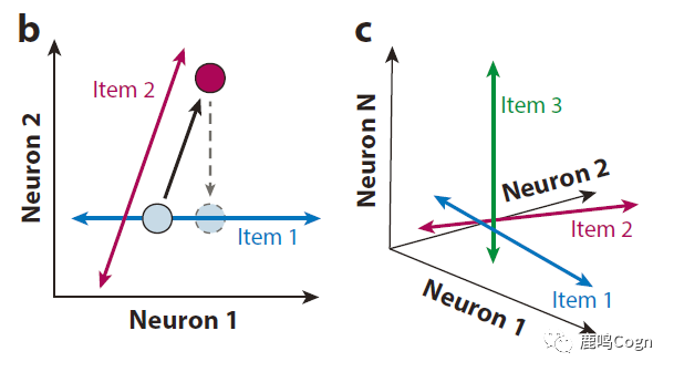 图2a 神经表征之间的干扰。表征性干扰发生在两个表征在神经空间上重叠的时候,比如item 1和item 2之间存在表征性干扰。竞争性干扰可以发生在位于相同区域的任何表征中(无论是否重叠),比如三个item间存在竞争性干扰。当两个或多个项目具有相互重叠的表征时,就会出现表征性干扰,这会损害读取相关项目信息的能力(影响记忆的内容),解释见图2b、2c的图注。表征性干扰的影响还会随着时间变化而改变。比如相似的记忆会倾向于合成一个单一的中间值(如红色和黄色会合成为橘黄色);不同的记忆会倾向于彼此相互排斥。图2b 如果只记忆Item1(蓝色圆点),可以通过将其投射到编码子空间(蓝色轴)对其进行解码。如果同时要记忆Item2,且Item2和Item1的编码轴不是正交的(如图2b,呈一个锐角),则会引起表征性干扰,即整个神经元集群的向量会向Item2偏离,这时候会对Item1信息解码产生干扰(即解码为了虚线的蓝色圆点)。图2c 如果新的记忆项目(如Item3)与正交(垂直)与其他Item的,那就不会产生表征性干扰,尽管竞争性干扰依然存在。竞争干扰导致神经反应的规则化(regularization)竞争性干扰在视觉加工中经常被发现,比如视觉场景中物体数量的增加会导致物体表征之间的干扰增加,反映在行为上就是个体会对视觉拥挤场景中的较大变化视而不见,反映在神经层面就是当一个刺激和其他刺激同时出现时,神经反应会减少。在WM中,竞争性干扰也常被发现。如图3a的上图表示,当猴子记忆1个item时,PFC神经元能够很强地表征项目属性,但当记忆的item变多,对第一个item的神经反应就会减弱。这种信号减少会导致关于第一个item的信息量的减少(图3a的下图)。这表明竞争性干扰作用于WM中的项目表征,从而限制了WM中的信息总量。图3(a) 记忆项目的增加会引起竞争性干扰,减弱神经元放电频率和每个项目的信息。Divisive normalization model可以很好地解释这种神经表征之间的竞争。该模型假设,网络在任何时刻的总神经活动都有一个上界。为了实现normalization,每个神经元的活动都被除以所有神经元的整体活动。在神经环路中,normalization被认为是由抑制性中间神经元介导的。