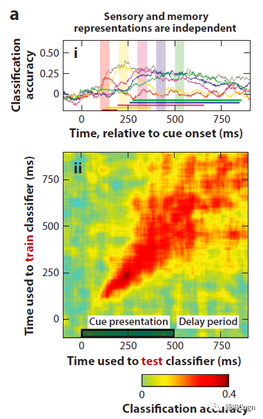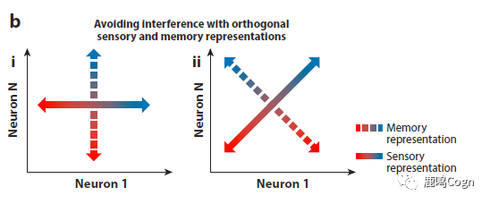 表征性干扰最常见的形式就是WM中的项目和新的感觉刺激之间的干扰,新的感觉刺激同样会涉及到和之前一样的感觉区域,这种表征的重叠会导致严重的干扰。避免这种干扰的一种可能途径是记忆的表现形式避免了与感官输入的重叠。近期的研究表明,感觉表征可以动态地转换为一种独立、正交的记忆表征。通过跨时间的分类分析,一个研究发现PFC皮层对某一事物的表征会随着时间的推移而变化。如图4a所示,猴子在编码时对刺激的感觉表征与对刺激的记忆表征无关,这说明感觉表征动态转换为了一个独立、正交的记忆表征,感觉表征和记忆表征是彼此独立的。图4a 基于PFC神经元活动解码呈现的刺激。不同的分类器在不同时间段(上图的阴影区域;下图的纵坐标)被训练,再对所有时间段进行测试(横坐标)。跨时间分类的表现(上图的纵坐标;下图的颜色)表明在感觉加工阶段训练的分类器无法解码记忆,反之亦然。这表明,感觉表征和记忆表征是正交的!感觉和记忆的正交表征可能有几种不同的环路机制。首先,他们可能是在独立的神经元集群中被表征的(图4b,左);这会减少表征之间的干扰量,因为他们将位于神经空间的不同维度(类似于增加稀疏性)。第二,感觉和记忆表征可能在相同的神经元集群中,但是感觉表征动态转换为了正交的记忆表征(图4b,右),这种转变有可能是因为感觉和记忆都有随机表征,由于高维空间中的随机向量彼此基本不相关,因此允许感觉和记忆的正交表征(这也是FWMM提出的机制:不同感觉子网络直接连接的随机性意味着他们之间没有什么干扰)。