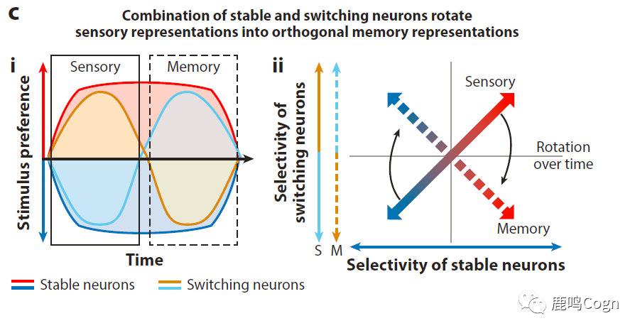 图4b 正交表征的产生机制。(左)感觉和记忆表征可以存储在彼此独立的神经元中;(右)虽然不在彼此独立的神经元中,但是可以存储在神经元集群相互正交的维度上。此外,近期的结果表明了另一种可能的机制:记忆也许通过结构化的旋转发生转换。感觉皮层内的两种神经元促进了感觉表征向正交的记忆表征的旋转,一种是保持感觉和记忆刺激偏好的稳定神经元(stable neurons),另一种是将刺激偏好从感觉转向记忆的转换神经元(switching neurons)。如图4C表示,这两种神经元亚群的组合导致了表征的旋转,从而让其免于被新输入的感觉刺激干扰。图4c (左)稳定的神经元在整个感觉和记忆期间都保持着对刺激的偏好(红色和蓝色线),转换神经元在感觉阶段和记忆阶段翻转了它们的选择性(金色和淡蓝色线);(右)稳定神经元和转换神经元的结合将感觉表征(实线)转换为记忆表征(虚线),这是因为转换神经元的反转引起了神经集群表征的旋转。除了避免感觉输入的干扰,神经表征的动态变化还可能减弱噪音的影响。这一点在这里不做展开。正如之前提到,WM的容量和灵活性是一种权衡,上述措施关注的都是最小化干扰的影响,而另一种限制干扰的方式就是建立专门的环路来保持特定的信息。当独立的环路被构建,这些项目将不会与其他记忆表征竞争。不过,这样的专门化环路是代价高昂的,尽管有实验证据表明其可能存在,但这种方法可能只被保留在维持最重要的信息上。