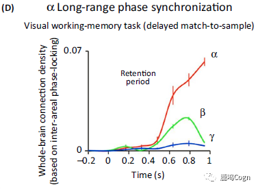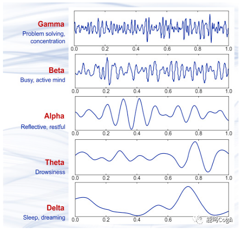 神经振荡(neural oscillations):在电生理学里,神经振荡是由神经系统的整体活动组成、以特定的频率周期性的增减的神经电活动。在头皮表面测量到的振荡被认为反映了局部场电位。利用脑电图(EEG)获得的振荡根据频率不同可分为delta (1-4 Hz)、theta (4-8 Hz)、alpha (8-12 Hz)、beta (12-30 Hz)、gamma (30-60 Hz)、high-gamma (60-160 Hz)等。
