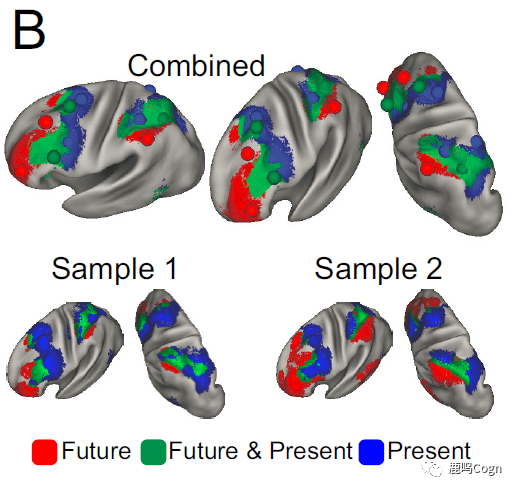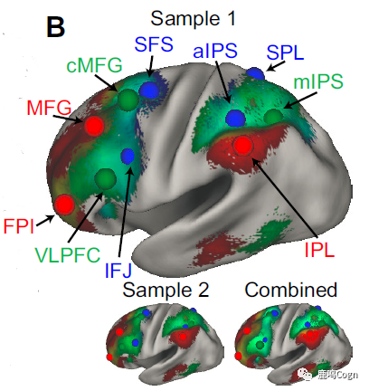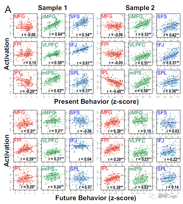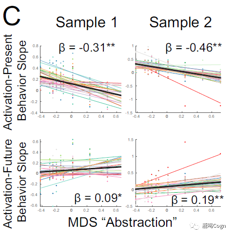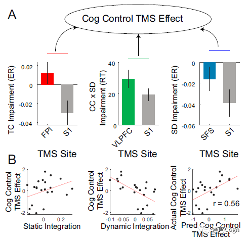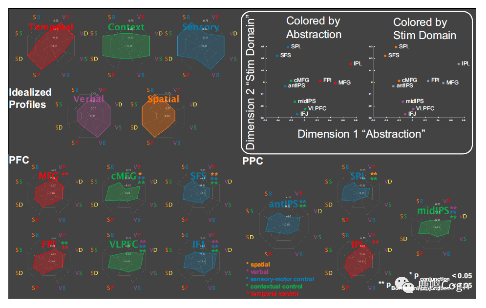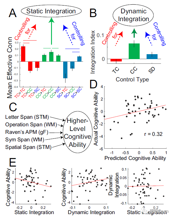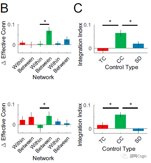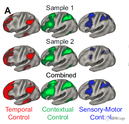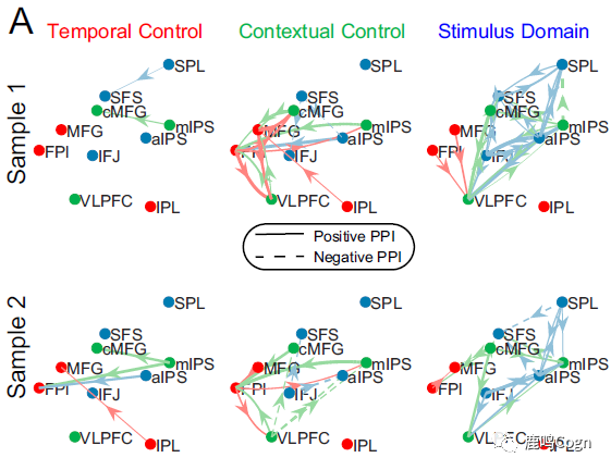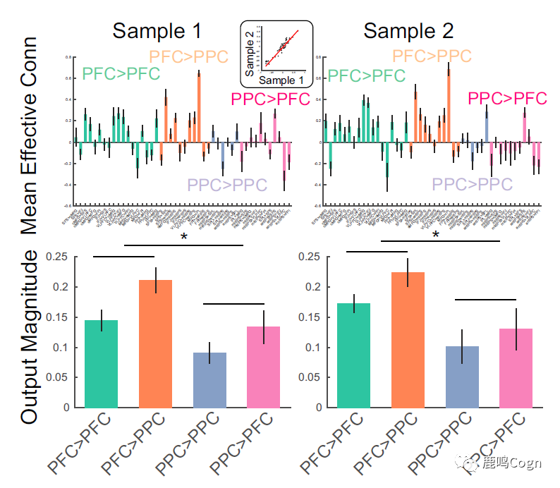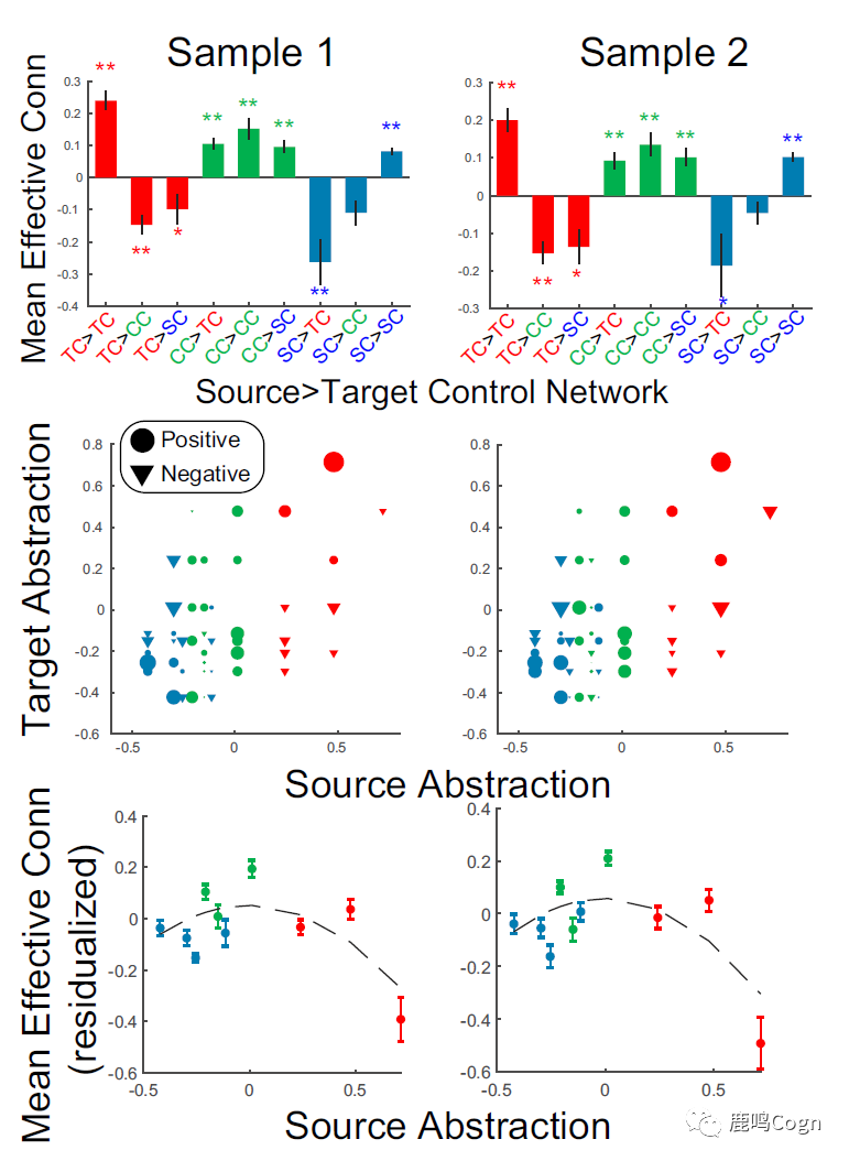 上面是针对各脑区的有效连接分析,为了看控制信号的整合,接下来从网络的层面来探索静态的连接。各脑区按照梯度变化被分配到不同网络中(感觉运动控制/情境控制/时间控制)。如图6(上图)所示,两个样本集中都出现了显著的source x target交互,具体而言,每个网络内的有效连接是最强的;对于感觉运动控制和时间控制网络,它们与其他网络间的有效连接是负向的,这个结果表明这些网络的活动可能抑制了其他网络的活动,从而分离了加工过程。反之,情境控制网络与其他网络间的有效连接是正向相关的,这表明情境网络可以加强其他网络的活动,从而促进整合加工。