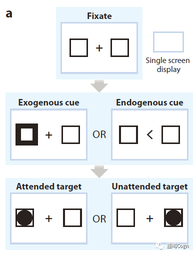 Posner任务(可细分为Exogenous cue和Endogenous cue,两者分别侧重自下而上的引导和自上而下的引导)