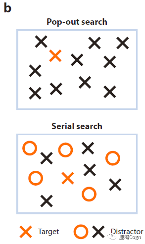 第二种常见的实验范式是Treisman的视觉搜索范式,即从一系列视觉刺激中找到目标刺激。Treisman著名的的特征整合理论提出,自下而上的刺激物理属性和自上而下的行为目标都会驱动视觉注意。在视觉搜索任务中,当刺激物具有明显独特的特征时(如黑色"X"中找橙色“X”),搜索可以自动化、快速的完成,不依赖于刺激的数目(这种Pop-out的搜索是由自下而上的特征控制的,如salience)。反之,当目标和干扰物共享某些特征时(如要找的"X"和干扰物"O"都是橙色),视觉搜索需要受意识控制地逐个搜索完成,完成时间与刺激数目正相关(受自上而下加工控制)。