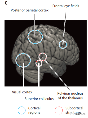 早期观点认为皮层下结构对注意控制也有作用,根据上述的注意不同阶段,Posner等人提出,顶叶皮层与当前注意力的脱离有关,丘脑的上丘和丘脑枕各自在控制空间注意力的分配中起作用。具体而言,上丘似乎在将空间注意力转移到一个新的位置上起作用,而丘脑枕对吸引新的注意力很重要。这一部分将在下面的将在下面关于皮层下结构的一节中进行。