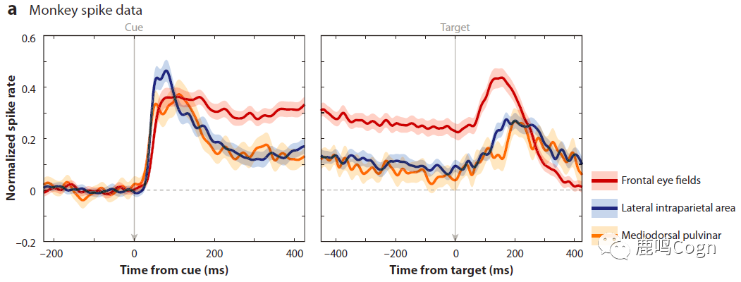 Buschman & Miller (2007)同时记录了猴子在完成注意相关任务时的额叶(dlPFC和FEF)和外侧顶叶区域(LIP)。第一个任务是需要刺激驱动的注意,第二个任务是需要目标导向的注意,虽然这两个区域都发出目标位置信号,但顶叶神经元在刺激驱动任务中更早发出目标位置信号,而额叶神经元在目标导向任务中更早发出目标位置信号(如下图)。这些结果表明,在刺激驱动注意时,顶叶主导额叶;而在目标定向注意时,额叶主导顶叶。