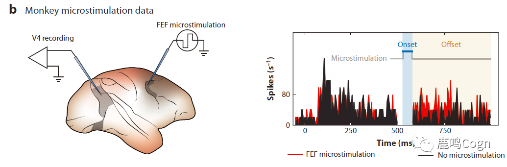 这种自上而下的注意力控制模型在非人类灵长类动物的因果操作中得到了进一步的支持。例如,在额叶区域(如frontal eye field, FEF)对神经元进行电刺激,会导致视觉皮层神经活动的注意力样变化和行为表现的改善(如下图)。这表明高阶皮层区域的微刺激可以模拟空间注意对视觉加工的影响。