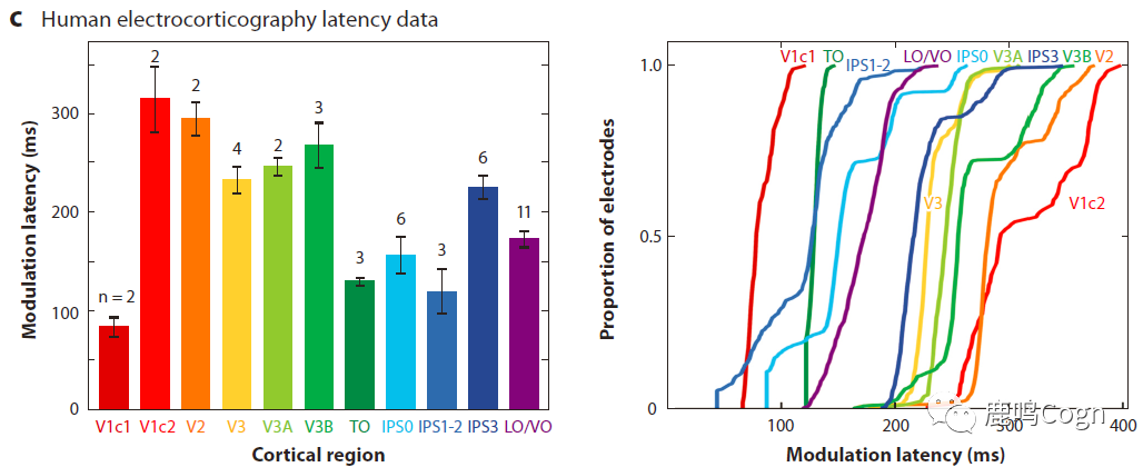 颅内脑电的结果,高阶脑区活动的潜伏期早于视觉皮层,说明空间注意过程中的区域间同步是由高阶皮质引导或启动的(IPS0, intraparietal sulcus, area 0; IPS1-2, intraparietal sulcus, areas 1 and 2; IPS3, intraparietal sulcus, area 3; LO/VO, lateral occipital and ventral occipital; TO, cytoarchitectonic area in anterior temporal cortex; V1c1, visual area 1, early component; V1c2, visual area 1, late component; V2, visual area 2; V3, visual area 3; V3A, visual area 3A; V3B, visual area 3B.)