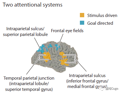 相比之下,Maurizio Corbetta等人提出了空间注意的两个分离网络,一个背侧额顶网络负责目标导向注意,一个腹侧额顶网络负责刺激驱动注意(具有偏侧化,包括TPJ和腹侧额叶)。