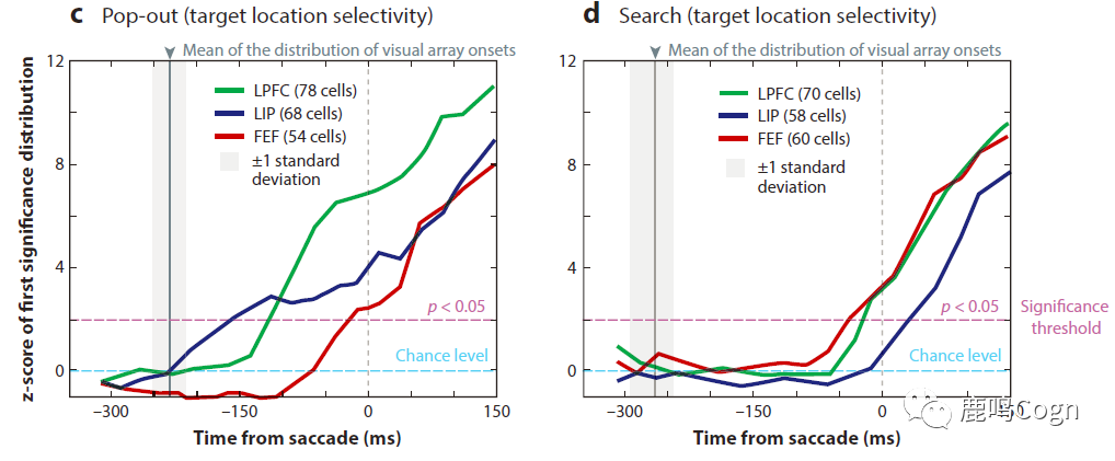 为了解决这个问题,近期研究利用电生理记录了猴子在视觉搜索中的额叶(FEF)和顶叶(LIP)皮层。虽然两个皮层区的神经元活动有相似性,但额叶神经元的编码信息还与动眼肌决策相结合(即眼跳活动)。这一结果在提供了注意网络功能分离的同时还引入了功能分离的另一个维度,即相对于顶叶神经元,额叶神经元的注意优先还会受到注意网络的运动功能的强烈影响。