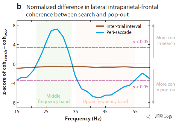 在眼跳前(peri-saccade),刺激驱动注意(pop-out)时主要是gamma频段的coherence更强;在目标导向注意时主要是beta频段的coherence更强。