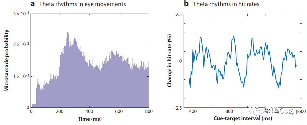 theta节律在环境采样中的作用。感觉和运动的采样都和theta节律有关,比如,微眼跳的概率、对于空间线索的击中率都呈现出周期性变化