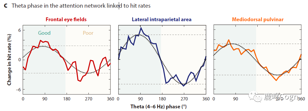 上图表明,行为振荡和theta频段的神经振荡具有关联性(both 高阶皮层和皮层下节点)。theta频率将注意网络的神经活动区分为两个交替的阶段,即增强阶段("good" theta phase; 图上绿底)和减弱阶段("poor" theta phase; 图上黄底)。这些图表明,行为表现是theta振荡相位的函数,这些实线的相位-检测函数(phase-detection functions)很好地拟合了正弦曲线(虚线),这些正弦波幅提供了Theta相位和目标检测概率之间关系强度的估计。作者提出一个可能性:感觉辨别力增强的"good phase"和注意相关的采样有关联,而"poor phase"与注意转移或眼动活动有关。