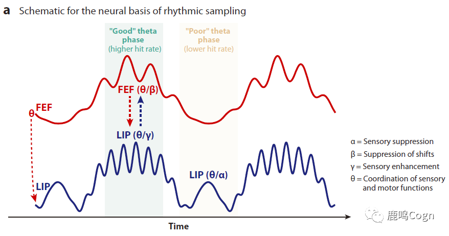 注意网络中的theta活动(3-8 Hz)将神经活动组织成具有时间动态和行为表现差异的有节奏的交替注意状态,在good phase里伴随着gamma和beta活动的增强,即感觉的增强和注意转移的抑制;在poor phase里伴随着alpha活动的增强,即感觉的抑制。箭头表示了频率特异性活动的方向(即从FEF到LIP)