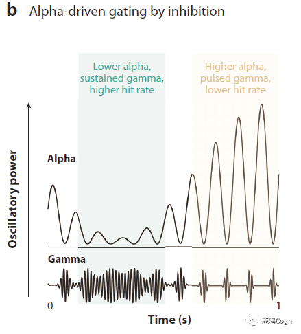 与gamma活动相反,alpha活动通常在处理任务无关信息的皮层中更高,因为与感觉抑制有关联。不过,增加的alpha活动似乎与节律性地干扰感觉加工有关,而非持续性的干扰。