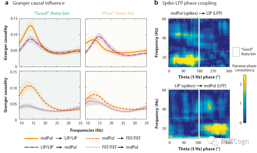 利用格兰杰因果(a图)和spike-局部场电位的相位耦合(b图)可观测到从丘脑枕到皮层的信息方向。背内侧枕部(mdPul)似乎在“good phase”专门化地组织注意网络的高阶皮质节点(mdPul→LIP/FEF);而“poor phase”的时候注意控制转移到顶叶LIP。这些研究结果表明,功能连通性每时每刻都在发生变化,反映了注意网络中不同节点的功能专业化
