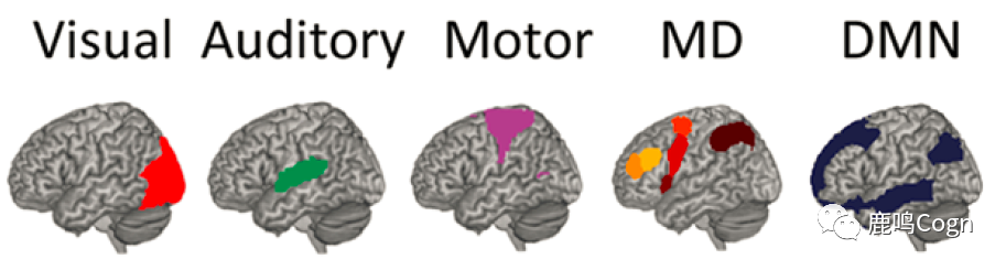 ,因此我们重点分析这些任务特征的编码。这里探索了五个脑网络的信息编码,分别是: