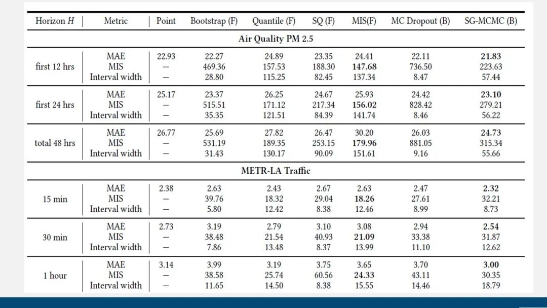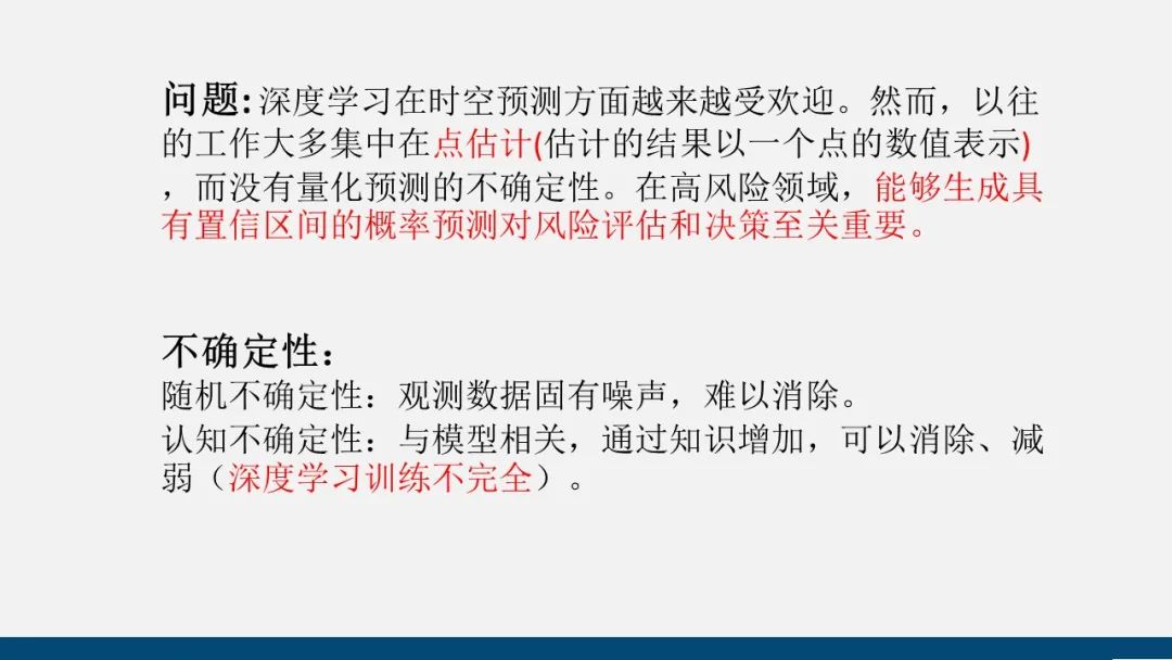 深度学习在时空预测方面越来越受欢迎。然而,以往的工作大多集中在点估计(估计的结果以一个点的数值表示),而没有量化预测的不确定性。本文通过统计方法生成具有置信区间的概率预测,从而帮助风险评估和决策。