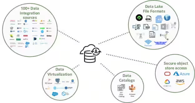 它提供了内置功能,可以访问和准备数据,以便从 100 多个应用程序、数据湖和数据库进行分析。借助自治数据库,您可以利用数据湖目录(例如 Oracle OCI 数据目录和 Amazon Glue),并立即访问这些数据以进行分析,而无需进行任何管理。