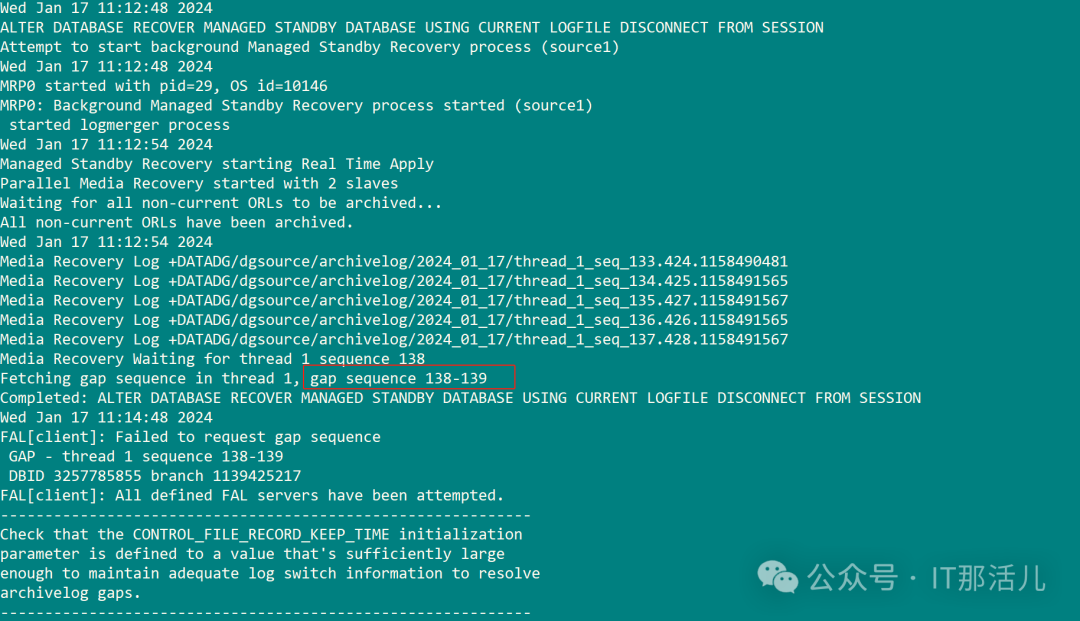 1)生产环境要避免这种情况发生。需要做好主备库的监控,如果有GAP产生了,需要及时定位原因(网络,IO,或者是硬件等问题)。 2)主备库根据归档的磁盘大小和产生的归档量制定好定时清理归档的脚本。