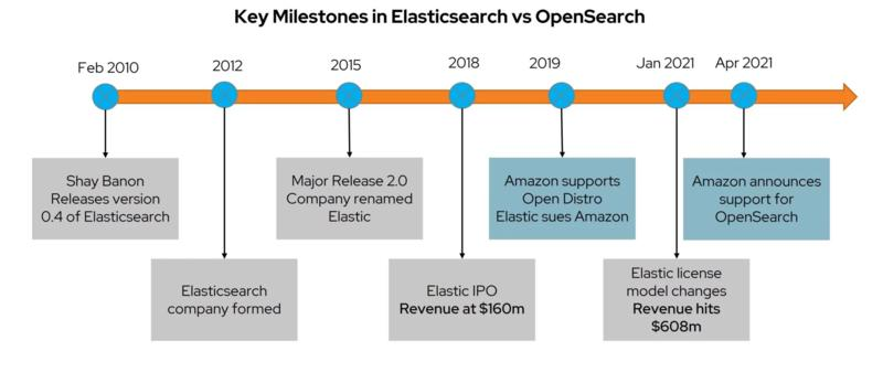2021年4月,亚马逊宣布,它将从Elasticsearch的最后一个开源版本(7.10.2)分支,推出一个新的开源搜索引擎项目。由于“Elasticsearch”名称不能再使用,新项目被命名为OpenSearch。亚马逊还将OpenSearch作为云服务提供,名为“Amazon OpenSearch Service”。