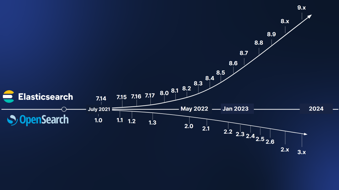 下图显示了Elasticsearch和OpenSearch两个搜索引擎解决方案的独立发展路径和发布节奏。