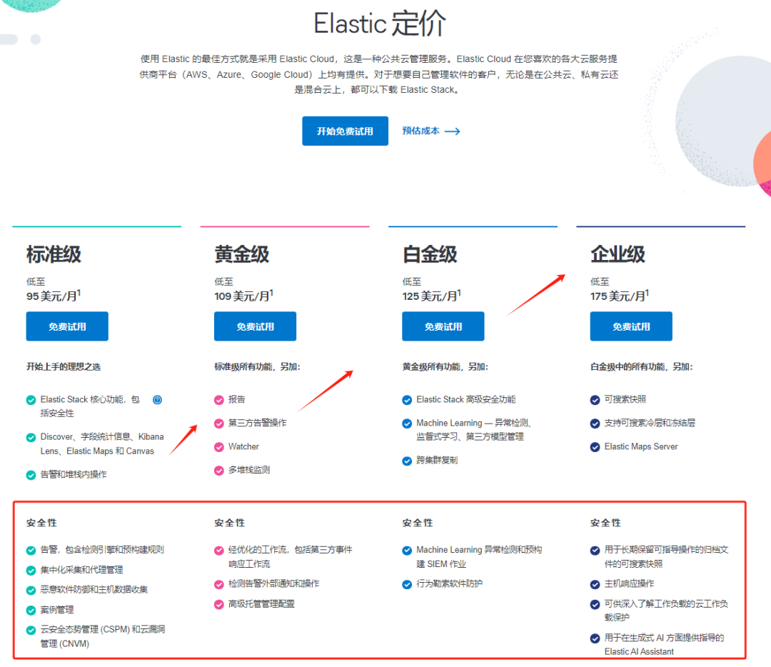 Elastic 付费功能清单列表:https://www.elastic.co/cn/pricing