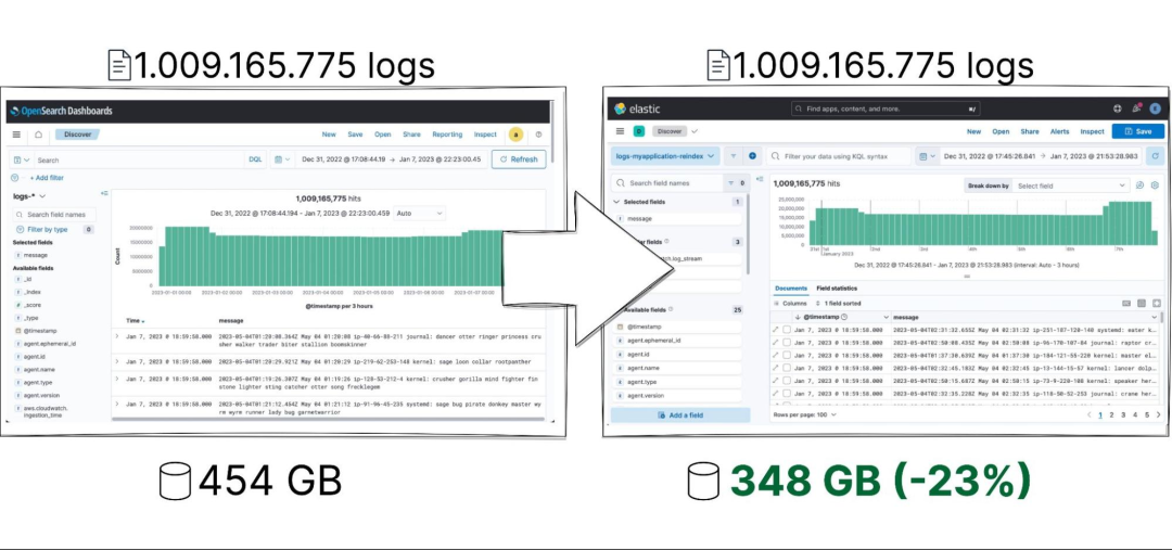 左侧是:Opensearch,右边是:Elasticsearch。明显对比可知:Elasticsearch 较 OpenSearch 节省了 23 %的存储空间。