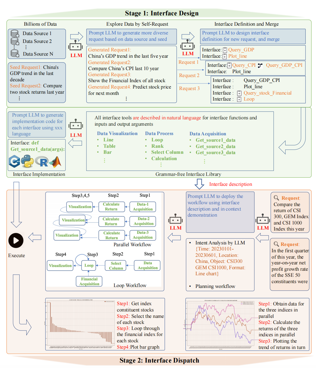 Data-Copilot主要分为两个阶段,第一个阶段是离线过程,通过self-request来构建大量接口,也就是预先生产了大量工具(例如图形渲染、数据查询、排序、数值计算等等),供在线过程的调用;第二个阶段是类似autoGPT的任务规划和工具调用。整体流程如下: