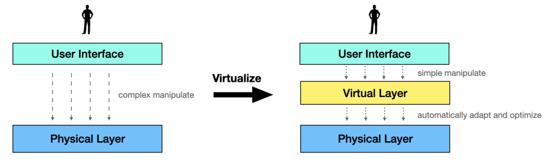 这种技术方案适合于已经在指标层有过一定技术积累的厂商,因为这一层要解决语义统一(什么叫“销售额”,口径怎么算的)、体系构建(销售额如何拆解、如何关联其他指标)、指标管理(今天张三建了一个指标,明天李四又建了一个)、查询优化(一个查询需求有多种实现路径,哪种最快最好)等一系列基础性问题,但这些功能往往散落在系统各处,大模型的出现将各类基础能力有机链接到一起并主动呈现在业务人员的面前。数据虚拟化不是AI/BI领域特有的产品,而是在大模型出现之前,为缓解业务快速发展和数据有序增长二者不平衡问题的一种技术手段,这里引用Aloudata技术团队对“数据虚拟化”的讲解:虚拟化是一种设计思路,它尽可能对使用者屏蔽物理运转细节,将原先需要使用者给出的指令,由机器通过恰当的规则和算法进行自动化实现。虚拟化本质就是在绝大部分场景中让用户可以按业务本身的需求去操作,而不需要为物理引擎的特性去做额外的优化操作。