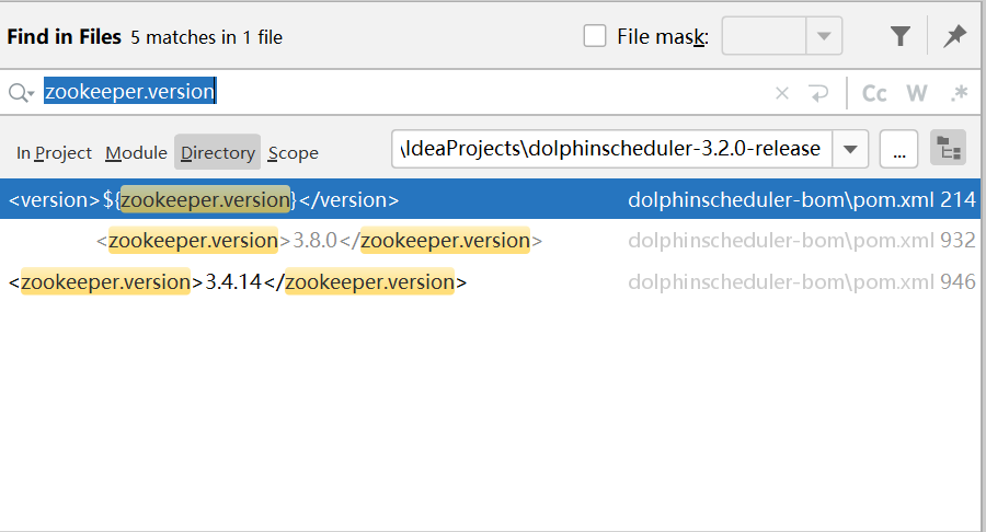 我不知道配置文件的指定的位置,在IDEA开发工具中按ctrl+shift+f组合键, 在项目所有文件中搜索:zookeeper.version