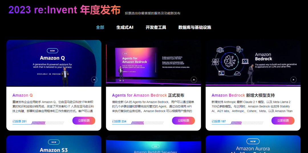 乘借 re:Invent 2023 的火热之势,我们在亚马逊云科技开发者社区发起了“re:Invent 2023 年度发布产品票选活动”,并得到了开发者们的积极参与。截至 2024 年 1 月 31 日,共有 1,493 位开发者参与了投票。