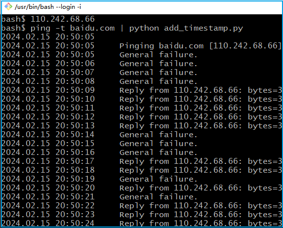 bash$ ping -t baidu.com | python add_timestamp.py2024.02.15 20:50:052024.02.15 20:50:05 Pinging baidu.com [110.242.68.66] with 32 bytes of data:2024.02.15 20:50:05 General failure.2024.02.15 20:50:06 General failure.2024.02.15 20:50:07 General failure.2024.02.15 20:50:08 General failure.2024.02.15 20:50:09 Reply from 110.242.68.66: bytes=32 time=32ms TTL=492024.02.15 20:50:10 Reply from 110.242.68.66: bytes=32 time=33ms TTL=492024.02.15 20:50:11 Reply from 110.242.68.66: bytes=32 time=31ms TTL=492024.02.15 20:50:12 Reply from 110.242.68.66: bytes=32 time=32ms TTL=492024.02.15 20:50:13 Reply from 110.242.68.66: bytes=32 time=33ms TTL=492024.02.15 20:50:14 General failure.2024.02.15 20:50:15 General failure.2024.02.15 20:50:16 General failure.