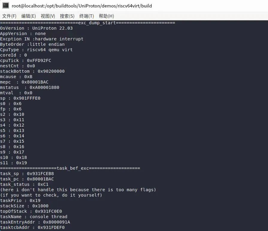 异常框架方面,添加了异常 DUMP 的上下文结构体,并实现了异常函数分发入口 API,以及与软件异常相关的 API,以确保 UniProton 能够有效地处理各种异常情况。
