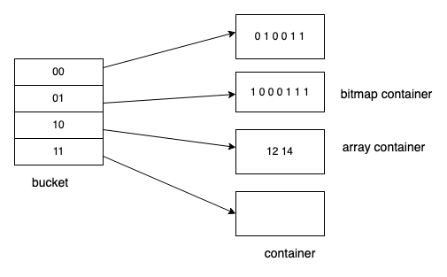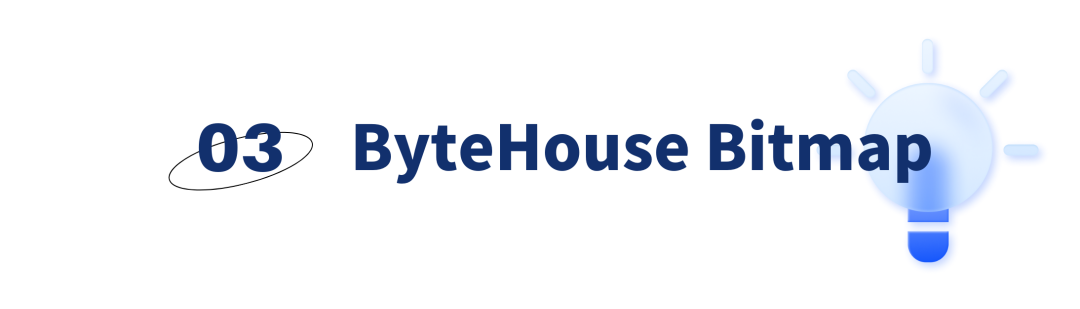 用来返回一个列中所有bitmap的元素个数。 假设一个用户ID用32位unsigned integer表示, 那么使用常规bit存储的方式需要2^32 bits ~ 512MB 的空间。如果需要为每个标签对应512MB空间,在标签量增长时,存储量会变得巨大。实际上,很少有业务会遇到2^32 大约40亿用户,因此实际场景中用户ID的分布是很稀疏的。其实可以基于这个特性,利用Roaring bitmap来进一步压缩这个空间。如下图所示:在32位的Roaring bitmap中,前16位用于分桶,该取值范围内没有数据则bucket不会被创建,后16位存在对应的container中。Container有两种类型:● Array container: 数据量较少的时候(一般少于8K容量),更省空间● Bitmap container 适合存储稠密数据、占用空间小在计算的时候只要对某些bucket中的值进行计算即可。扩展到64位的roaringbitmap的时候,我们可以通过一个map<uint32_t, Roaring>来支持,前32位作为map的key,后32位用roaringbitmap存储。在大部分场景中,以上的roaring bitmap已经有很好的性能。但是在字节跳动的实际场景中,产研团队发现由于user_id 不是连续生成的,array container的数量占比会很高。对两个稀疏人群的交并补操作就变成了对两个有序数组的计算,这种计算对比单纯的位计算,在性能上还是有明显的差异。因此在ByteHouse中,是通过字典方式对数据进行编码,让数据更加集中。CREATE TABLE id_tags (
