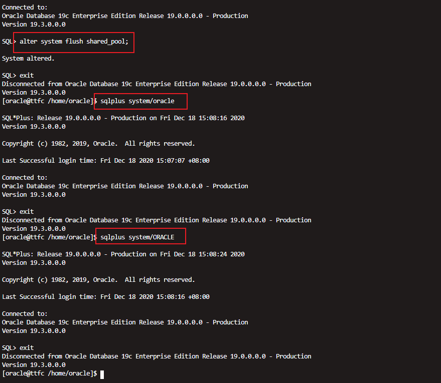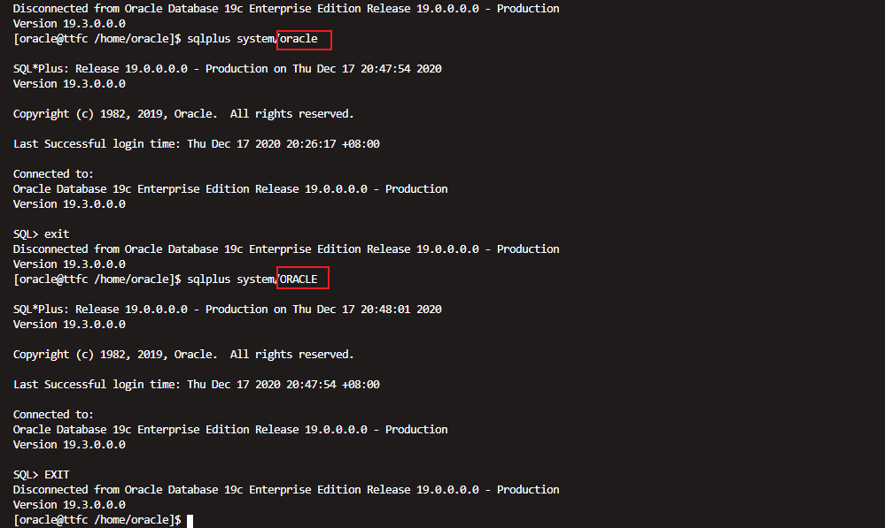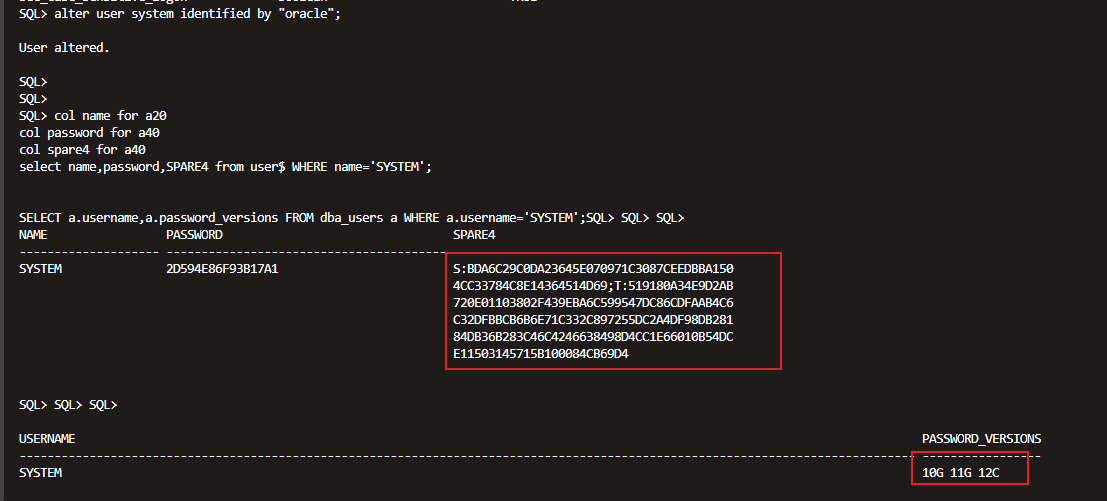 但是通过测试values user$.spare4恢复以前密码后,user$.password列为空(SYS用户除外,其他用户为空,且由于12.2之后 ORACLE 口令文件,存放至ASM里面,因此无法再通过alter user sys identified by 'values'重置SYS密码,登陆提示密码错误,如果用user$.password重置密码,那么spare4为空,且PASSWORD_VERSIONS版本会下降成10g,就不会区分大小写了),但是密码依旧区分大小写。这里可以看出来,user$.password项以后可能取消掉,为了兼容性,因此Oracle在后续版本中依旧保留.