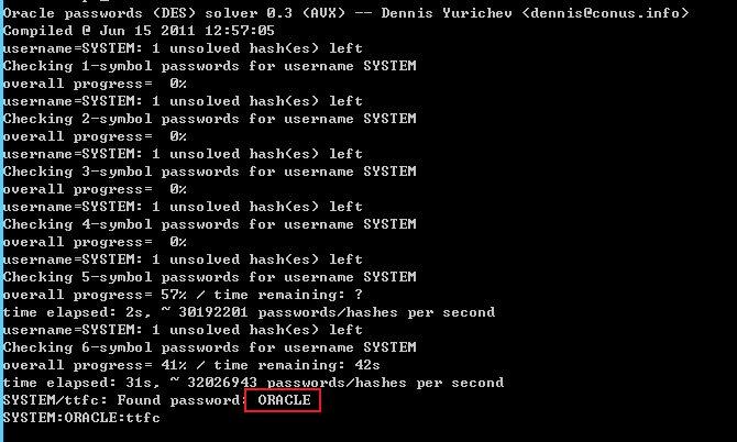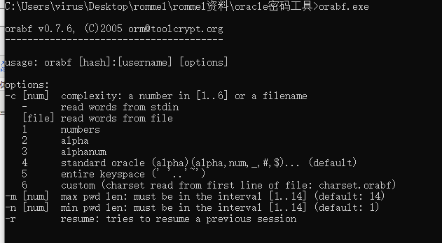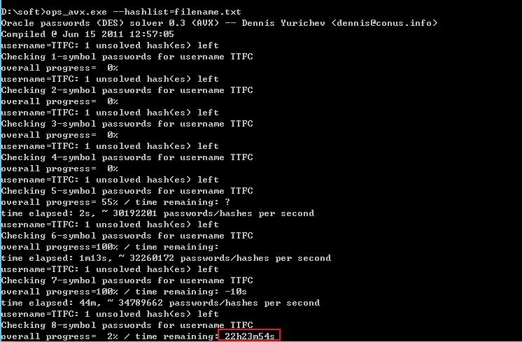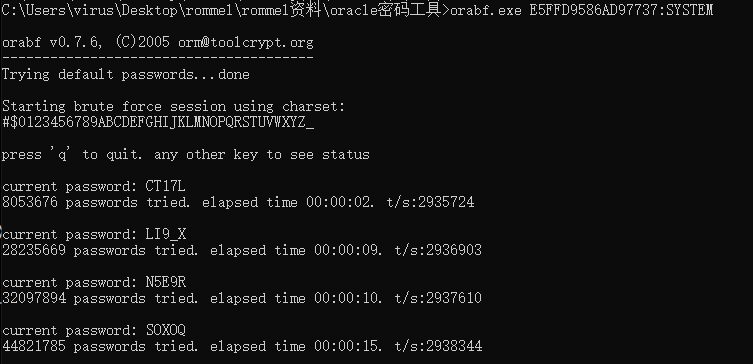 如果稍微复杂的密码,orabf-v0.7.6破解也同样是遥遥无期(计算机性能好一点可能会稍微好一点)。