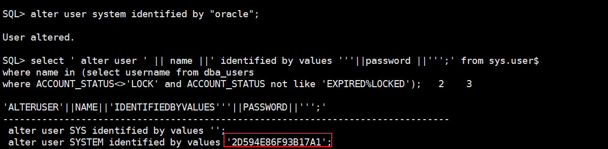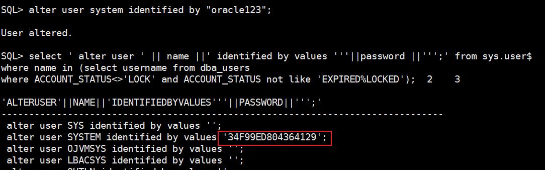 SELECT ' alter user ' || NAME || ' identified by values ''' ||B.SPARE4 || ''';' AS reset_password
