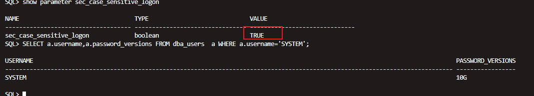 综上所述,说明password_versions(变成了10g,11g,12C)的优先级大于sec_case_sensitive_logon这个参数,在sec_case_sensitive_logon下(还是为true),如果我修改了USER$.SPARE4(为空),可以实现不区分密码大小写的问题;