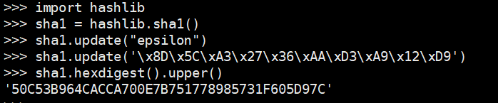 密码是“ epsilon”,所以计算 SHA1 哈希值'epsilon' + 8D5CA32736AAD3A912D9: