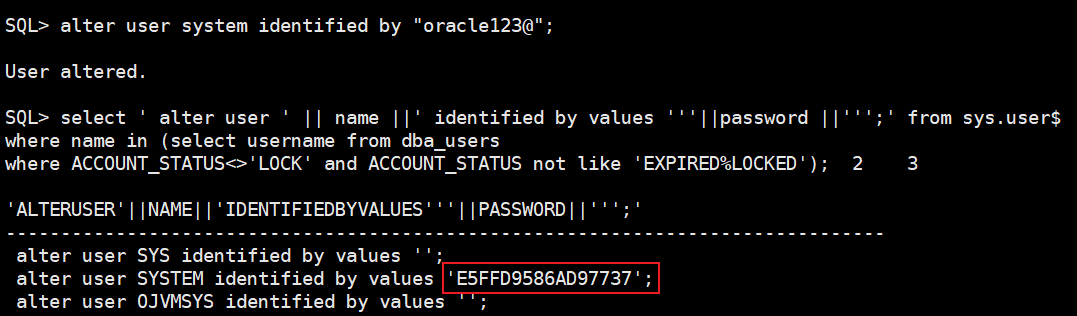 select ' alter user ' || name ||' identified by values '''||password ||''';' from sys.user$