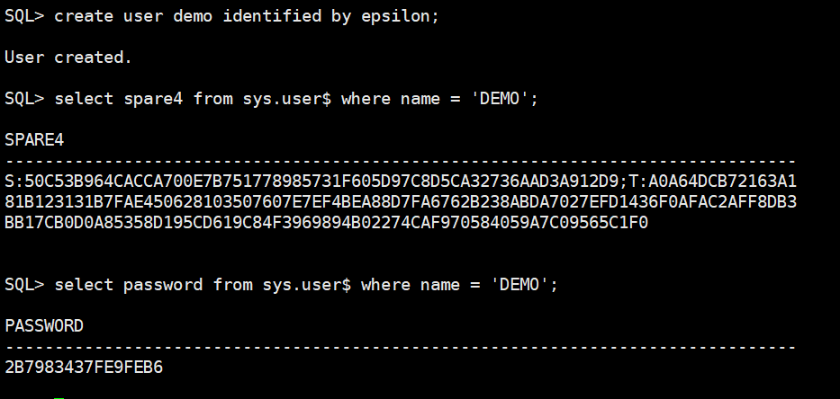 create user demo identified by epsilon;select spare4 from sys.user$ where name = 'DEMO';