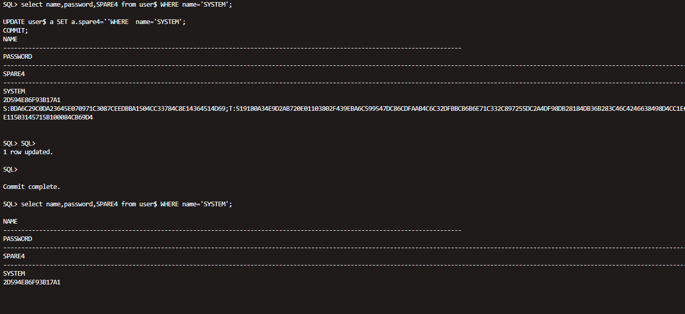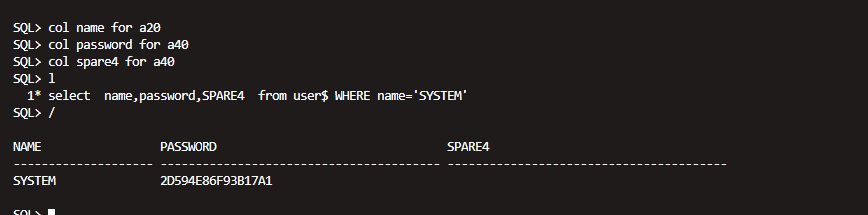 select name,password,SPARE4 from user$ WHERE name='SYSTEM';