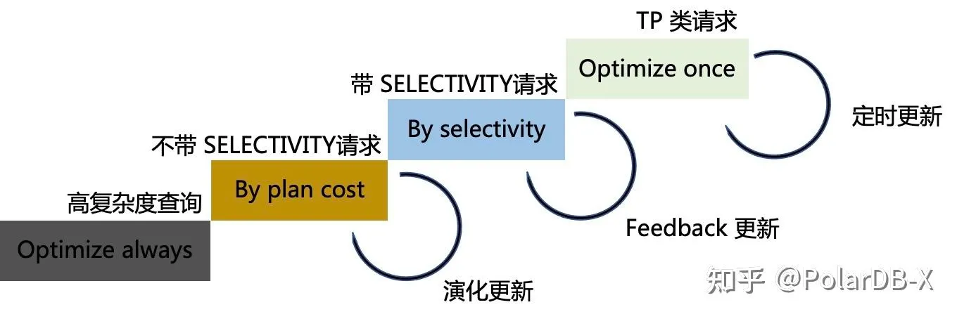 这篇文章提及了Optimize Once和Optimize Always的概念,PolarDB-X采用的理念就是Optimize Once,尽量少进入优化器,主要的考量是PolarDB-X的优化器结构相当复杂,如果采用Optimize Always,优化器的耗时在高并发tp的查询中代价将无法忽视。