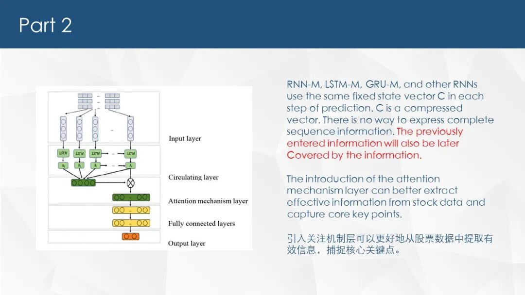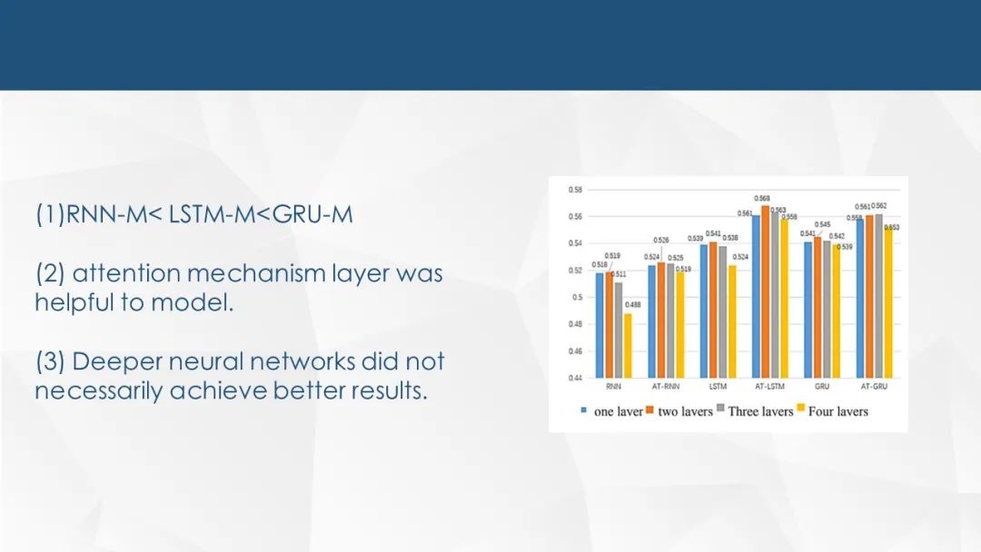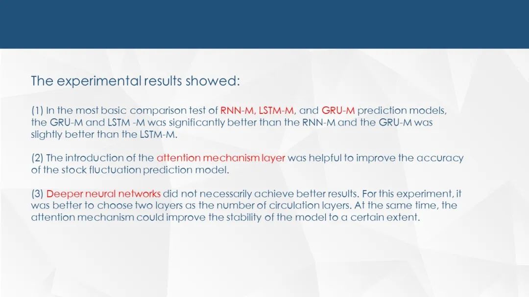 中文摘要:股票数据具有较长的记忆性,即股票价格的变化与历史交易数据密切相关。递归神经网络具有良好的时间序列特征提取能力。分别提出了基于RNN/LSTM/GRU的预测模型。注意机制具有选择和聚焦关键信息的能力。因此,本文在传统递归神经网络的基础上,介绍了注意机制,提出了基于AT-RNN/AT-LSTM/AT-GRU的预测模型。本文介绍了一种基于递归神经网络的股票价格走势过程。根据本文所涉及的神经网络原理,建立了6个模型,分别是基于RNN、LSTM和GRU的股票价格趋势预测模型。在这三种模型的基础上,利用引入的注意机制建立了AT-RNN- M、AT-LSTM和AT-GRU -M预测模型。并对六种模型进行了测试和分析,分别探讨了RNN,LSTM,GRU的性能差异本文对其进行了建模和实验。结果表明:(1)在最基本的RNN-M、LSTM和GRU-M预测模型比较检验中,GRU-M和LSTM-M显著优于RNN-M,GRU-M略优于LSTM-M;(2)引入注意机制层有助于提高股票波动预测模型的准确性;(3)较深的神经网络不一定能取得较好的效果。