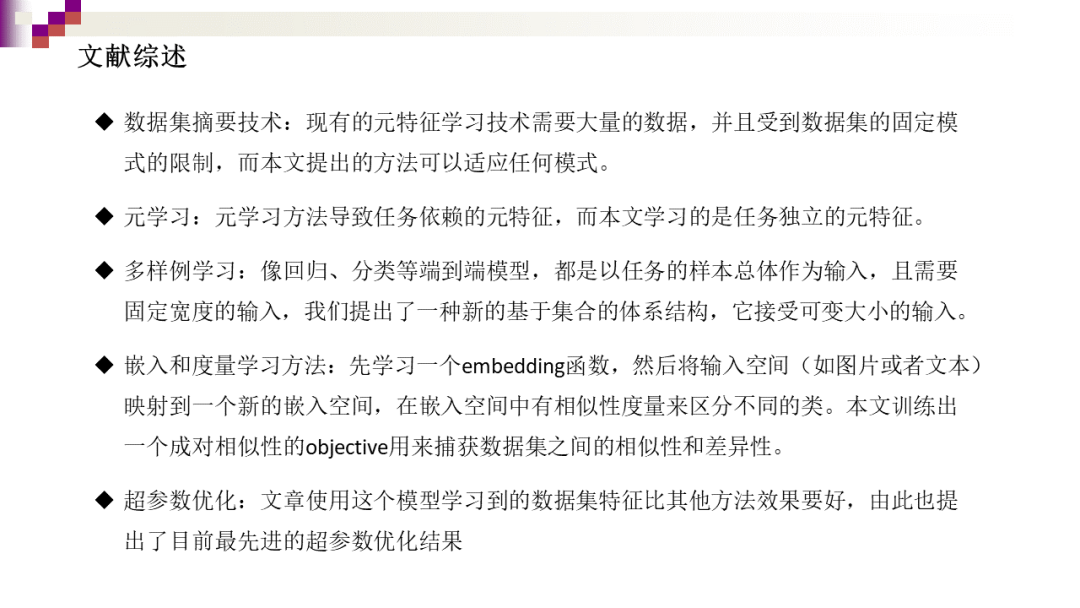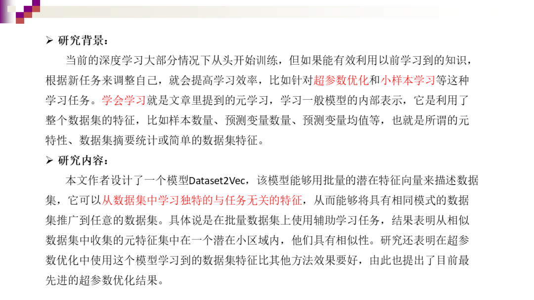 中文摘要:比如像对一个数据集的模型进行超参数优化或者小样本学习等这种机器学习任务如果不是对每一个新的数据集从头开始,而是从以前的运行中继承结果,是可以大大提高训练速度的。元学习是利用整个数据集的特征进行学习,如实例数量、预测器数量、预测器均值等等,所谓的元特性,数据集摘要统计或简单的数据集特征,迄今为止都是手动操作的。近年来,基于变分自动编码器的无监督数据集编码模型已经成功地学习了在某些情境下都遵循相同模式数据集的特征。在本文中,我们提出了一个新的模型叫Dataset2Vec,该模型能够用潜在特征向量来描述数据集,从而能够将具有相同模式的数据集推广到任意的数据集。为此,本文对数据集的批次使用辅助学习任务,特别是从不同的数据集中区分批次。研究结果表明,从相似的数据集中批量去除的自己,它们的元特征在一个嵌入空间中保持了原来的相似性。同样,我们还发现在超参数优化模型中使用Dataset2Vec学习到的数据集特征,比迄今为止使用其他方法的效果还要好。借此,我们也提出了当前最先进的超参数优化结果。